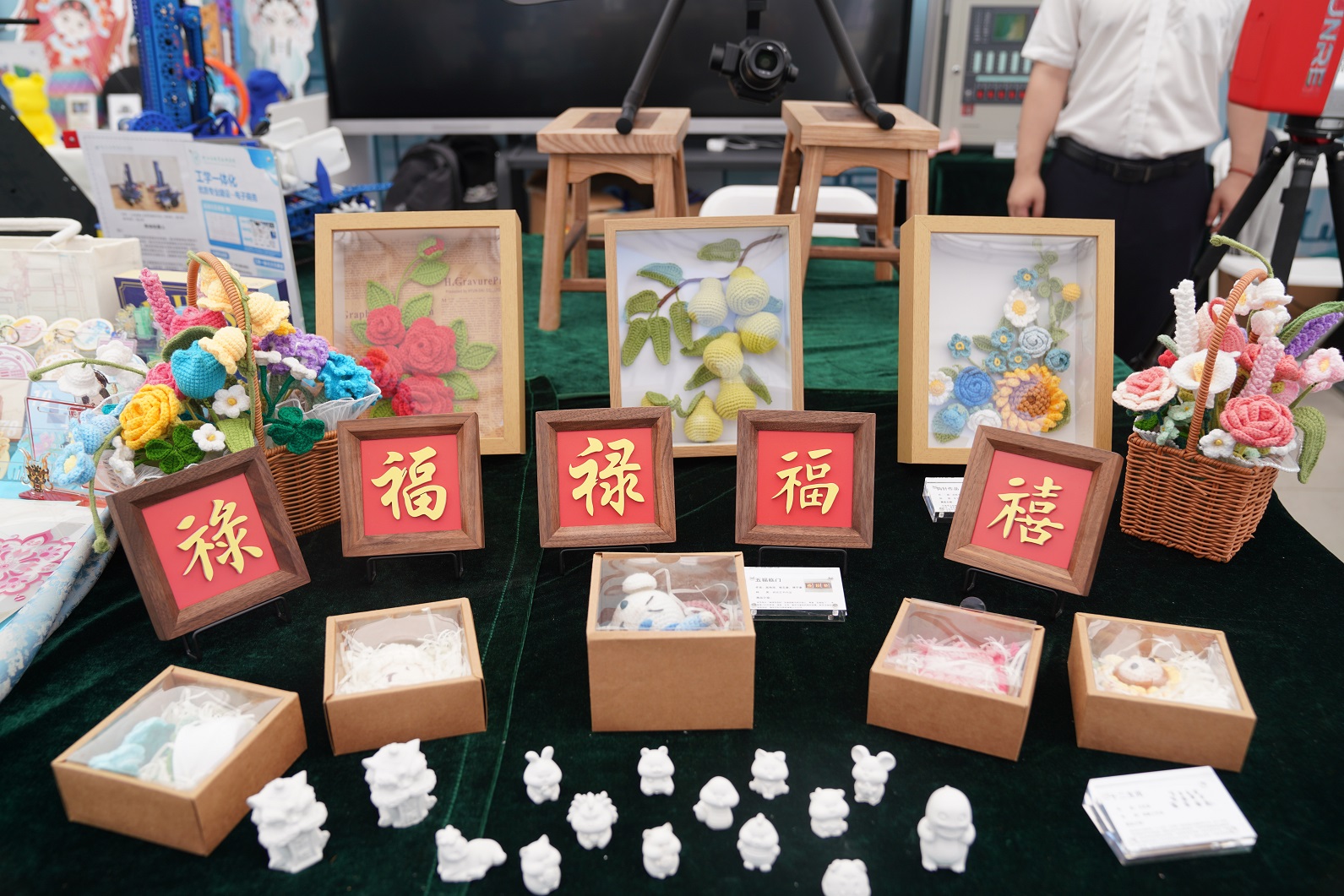 活动现场设置体验互动区、招生展示区、双选合作区三大核心展区。在学院的招生展示区,极富特色的技能作品展示吸引了众多观众驻足:瓷砖艺术作品“福禄寿喜财”五福图案为设计核心,寓意“五福临门”,承载着人们对生活的美好祝愿;混凝土建筑艺术作品“十二生肖”将十二种生肖形象转化为立体雕塑,展现民俗文化的独特魅力;手工木工作品“宋韵·文房用品系列”融合宋代元素,体现文人雅士的美学追求与家国情怀;空地协同数字建造系统由建筑喷涂/砌筑机器人、测绘无人机和移动式三维激光扫描仪三大单元组成,直观展示智能建造的技术魅力与职业技能的时代价值……这些作品或色彩明快、造型可爱;或紧跟时代、与时俱进,令人赞叹不已。