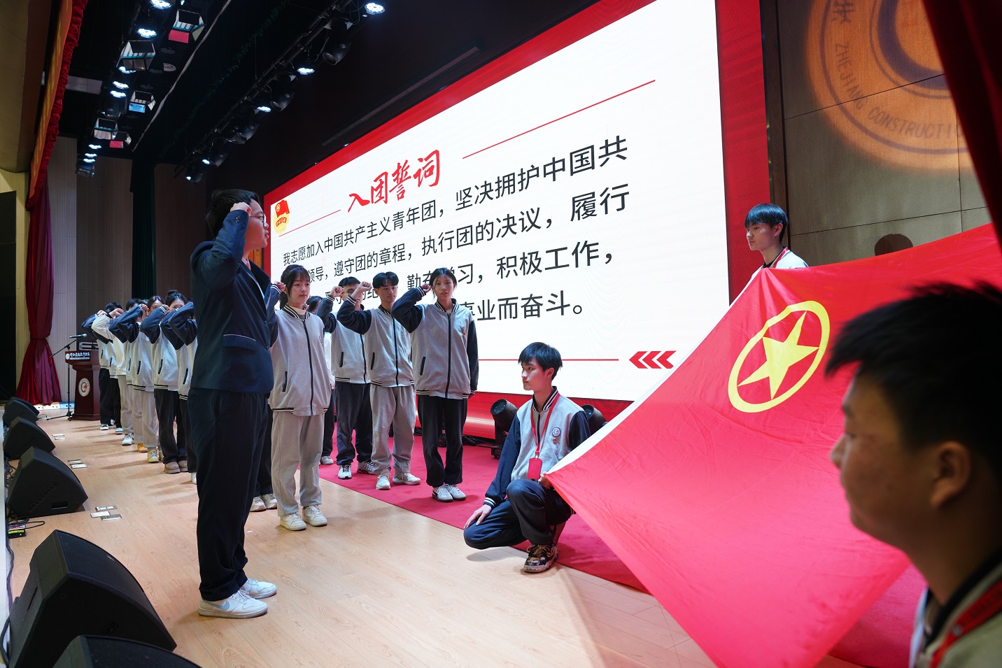 “我志愿加入中国共产主义青年团,坚决拥护中国共产党的领导……。”佩戴团徽的新团员们在陈飞达同学的带领下,面向团旗进行庄严宣誓。誓言掷地有声,展现了团员们对中国共产主义青年团的忠诚热爱和为共产主义事业奋斗的决心。