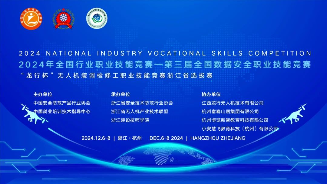 12月6日至8日,2024年全国行业职业技能竞赛——第三届全国数据安全职业技能竞赛暨第三届全国安防行业职业技能竞赛“龙行杯”无人机装调检修工浙江省选拔赛在浙江建设技师学院举行。此次竞赛由中国安全防范产品行业协会、中国就业培训技术指导中心联合主办,浙江省安全技术防范行业协会、浙江省无人机产业技术联盟、浙江建设技师学院共同承办,同时得到了江西龙行无人机技术有限公司、杭州富春山居集团有限公司等多家企业的大力协办。