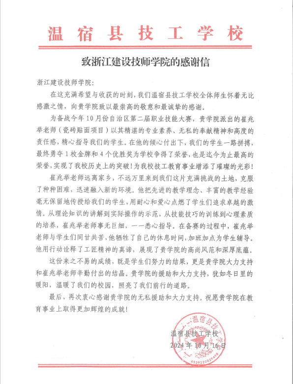 近日,学院收到一封来自新疆阿克苏温宿县技工学校的感谢信,感谢学院世赛冠军、特级技师崔兆举远赴温宿县技工学校,为参加新疆维吾尔自治区第二届职业技能大赛的选手做赛前指导,帮助他们实现技能水平的再提升,并在大赛中获得瓷砖贴面项目1金1优胜。