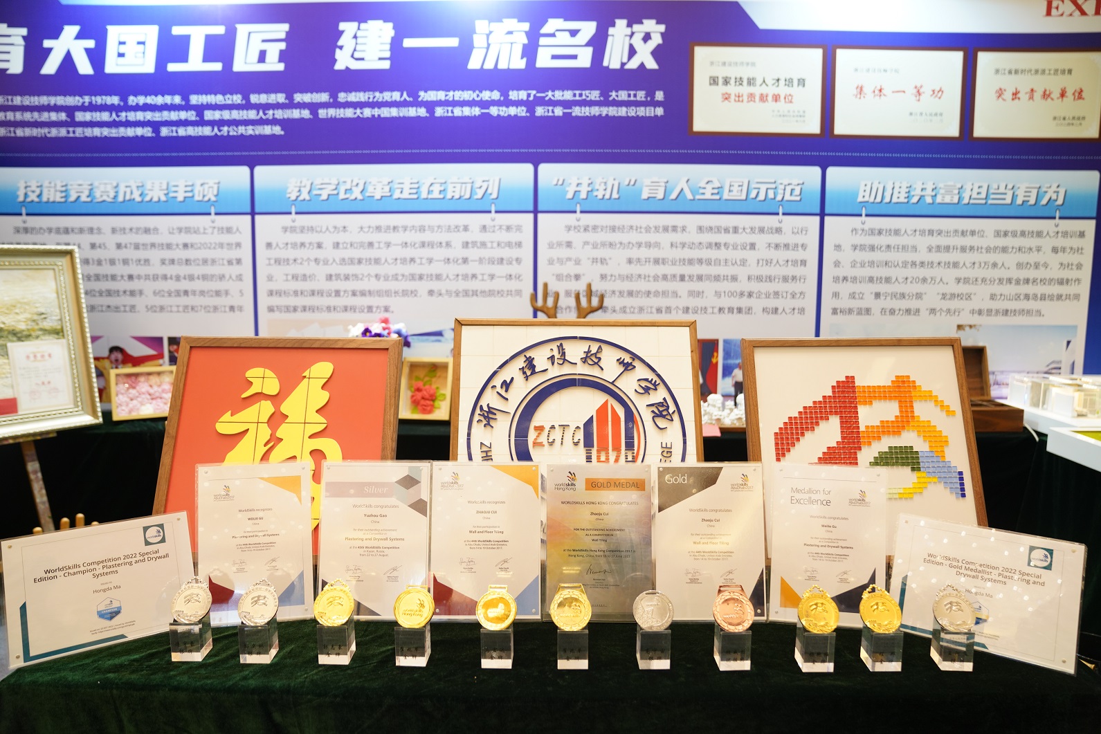 在学院展位,一列排列整齐闪耀着光芒的世界技能大赛奖牌尤其引人注目,它们传递着学院在高技能人才培养道路上的坚实步伐和突出成就。展位中,还有无人机测绘、3D打印、建筑机器人、花艺、木工手作、艺术画等彰显学院办学特色且兼具传统和现代风格的展品同样吸引眼球,观展人员纷纷点赞学院“一流”的办学成果和产教融合的成效,情不自禁拿出手机用镜头记录一番。第47届世界技能大赛两位获奖选手鲍芳涛和郭志豪身穿世赛领奖服也来到现场,为母校的本次参展增添了一道靓丽的风景线。