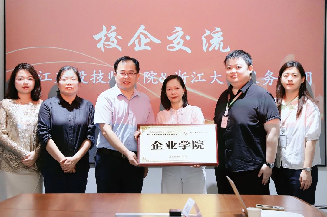 为加强校企合作,深化产教融合,推动物业管理专业的人才培养、技术创新及社会服务再上新台阶,8月1日,浙江建设技师学院与大家服务集团举行“企业学院”授牌仪式。大家服务集团副总经理万芳芳及高层管理人员,浙江建设技师学院副院长张国华、经济管理系主任郭靓及物业管理专业的师生代表共同见证者一重要时刻。