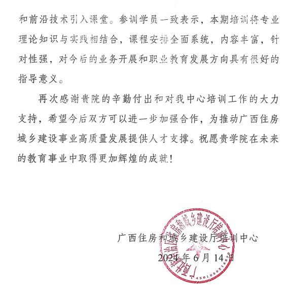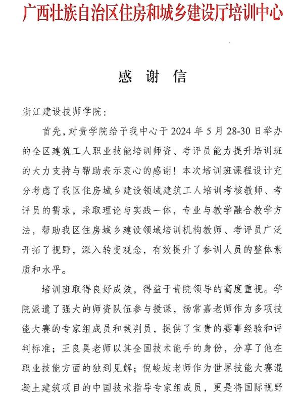 近日,学院收到一封来自广西壮族自治区住房和城乡建设厅培训中心的感谢信。信中,自治区住建厅对我院在广西全区第一期建筑工人职业技能培训师资、考评员能力提升培训中的大力支持与帮助给予了高度评价,希望与我院未来可以进一步加强合作,为推动广西住房城乡建设事业高质量发展提供人才支撑。