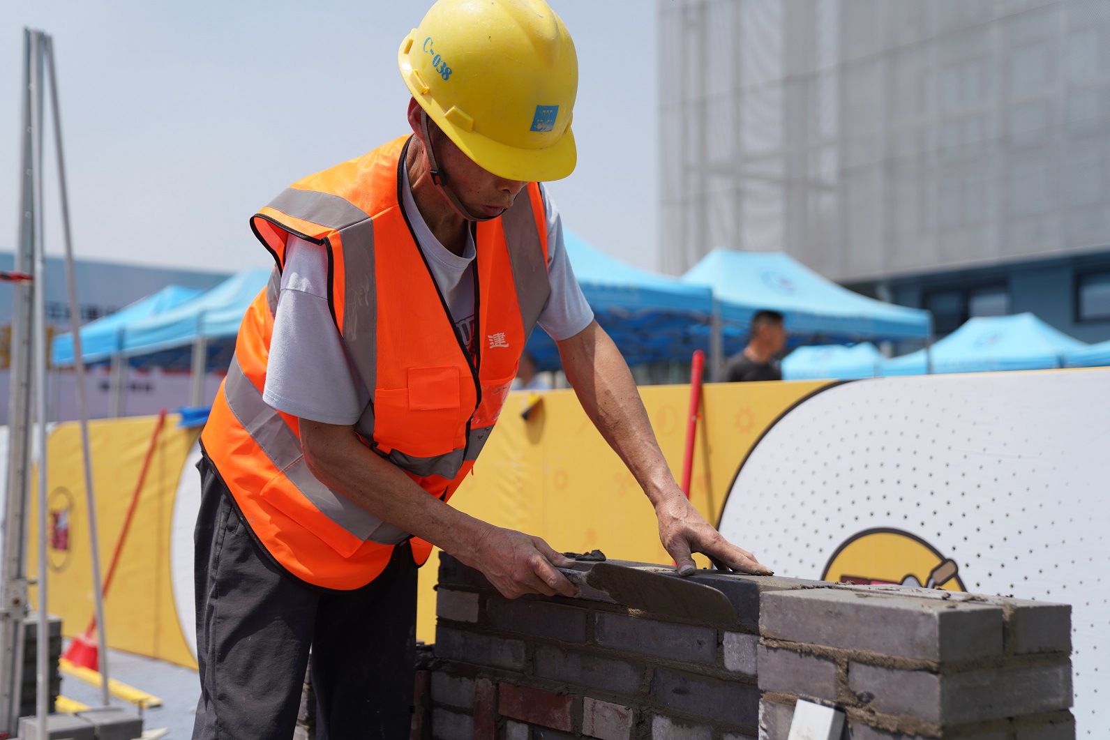 比赛以“匠”字为主题,结合行业实际,突出世界技能大赛特点,要求选手在3小时内根据图纸,自行完成抄平、放线、立皮数杆、摆砖撂底、盘角、挂线、砌砖、勾缝及最后的场地清理工作。