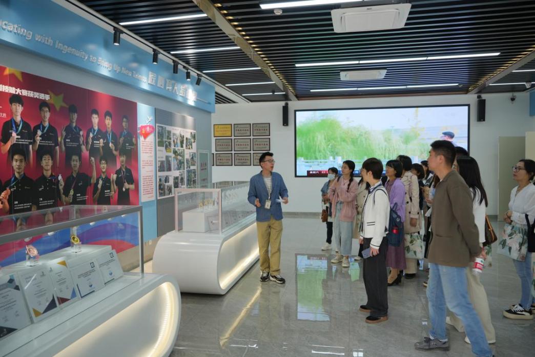 随后,教研组参会人员先后参观了瓷砖贴面、抹灰与隔墙系统、砌筑、数字建造等世赛项目,精确到纤毫之间的技艺、世界级的荣誉成果让到访老师们惊叹不已,直呼震撼。在技能节项目观摩环节,建筑艺术系组织的中式家具设计与制作、造园景观施工、花艺气球等项目凭借精巧构思与细致施工,也赢得了参与教师一致好评。