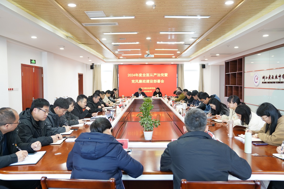 3月6日,浙江建设技师学院召开2024年度全面从严治党暨党风廉政建设部署会。深入学习中央纪委三次全会、省纪委十五届三次全会精神和集团2024年反腐倡廉建设工作会议暨“四治四促”作风建设专项行动推进会精神,通报剖析违纪违法典型案例,研究部署学院2024党风廉政建设工作。会议由学院纪委书记、工会主席陈勇主持,学院两级领导班子参加会议。