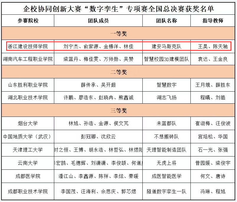 12月23日至24日,全国首届企校协同创新大赛全国总决赛暨颁奖典礼在清华大学圆满落幕。浙江建设技师学院的“建安马斯克”队表现优异,获得了“数字孪生”专项赛全国一等奖(第一名),王昊老师获评“优秀导师”,学院被授予“优秀组织单位”,充分展示了学院在专业建设中数字化转型的变革成果。