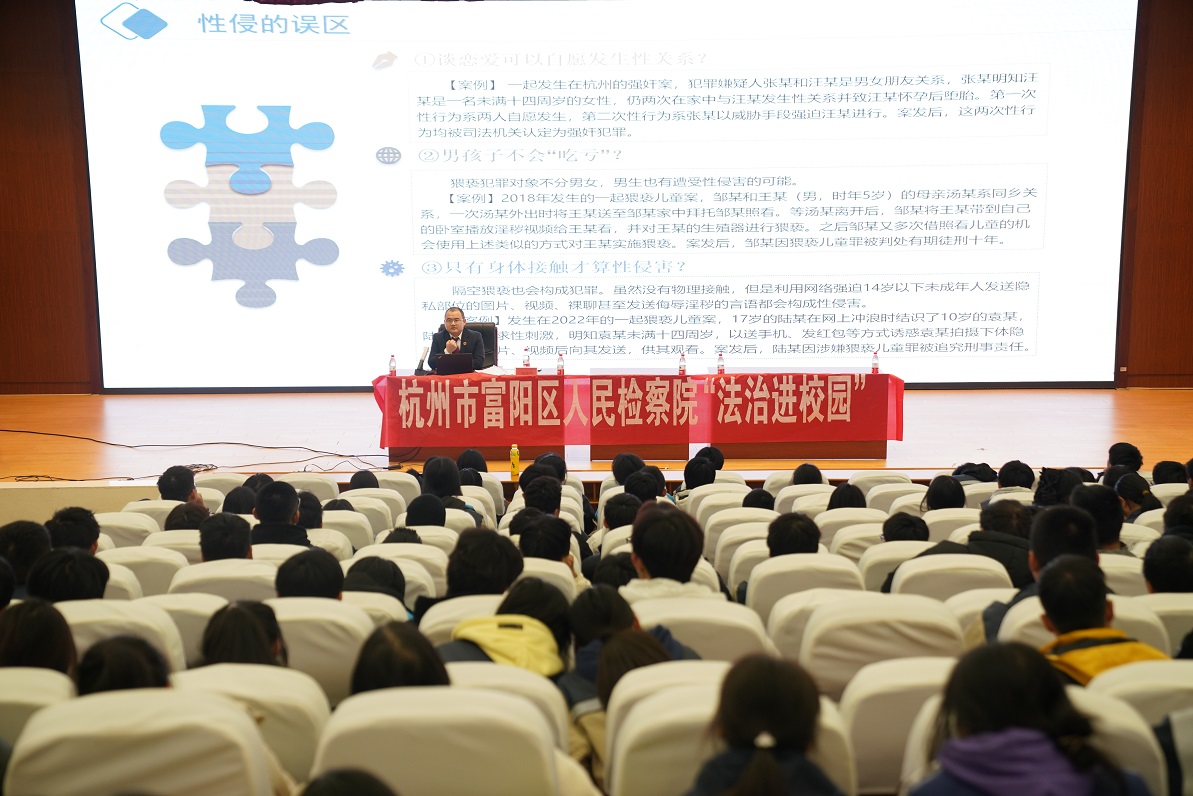 为加强学院新生遵法学法守法用法意识,切实保护我院青少年和未成年人合法权益,今天下午,学院联合杭州市富阳区检察院举办了“法治进校园”法制教育讲座。