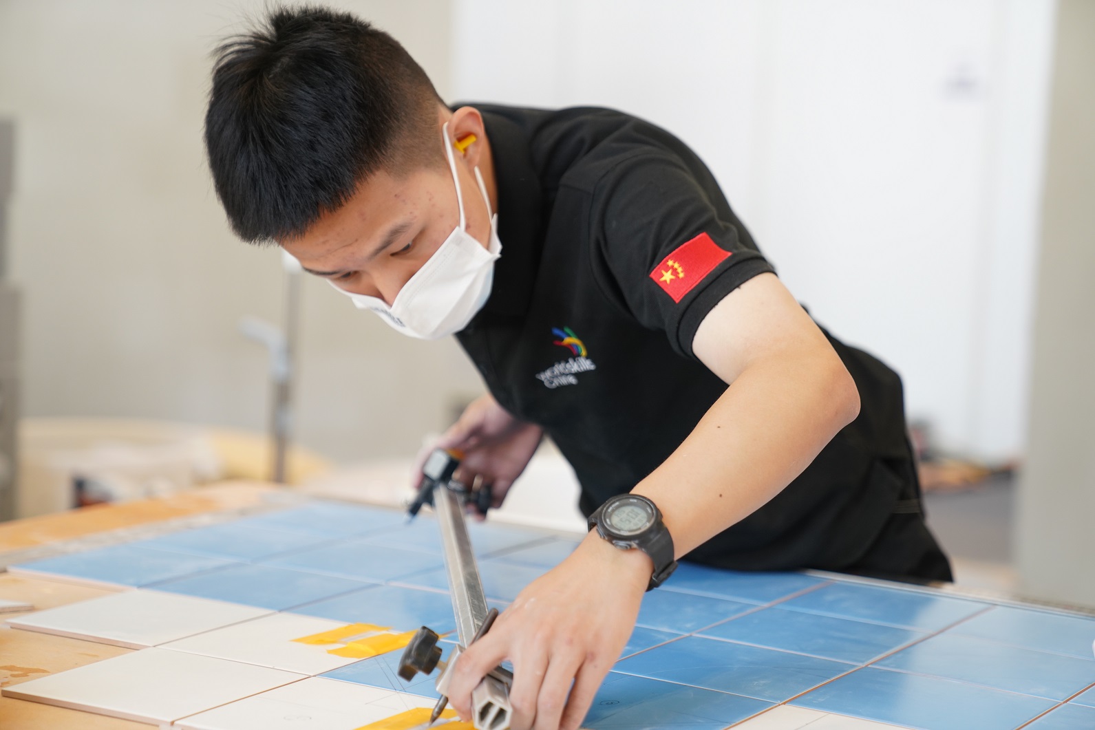 林宇翔来自景宁,就读于浙江建设技师学院景宁民族分院“建筑施工”专业。他平时刻苦学习,成绩十分突出,通过“技能先锋营”这个平台,层层选拔成功入选了学校的“瓷砖贴面”项目实训队。经过艰苦训练和国家级教练的传授指导,他终于走上了全国技能大赛的舞台。