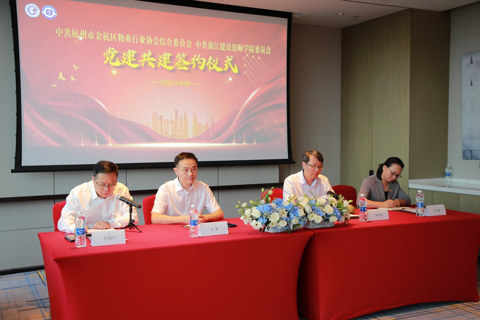 余杭区住房和城乡建设局党委委员、区物业行业协会综合党委书记、区住房中心主任许彬,学院党委书记徐永良,学院党委委员、副院长毛文娟,余杭区物业行业协会党支部全体党员、协会会长单位和副会长单位代表约40人参加。签约仪式由余杭区物业行业协会支部书记、区住保中心副主任忻国宁主持。
