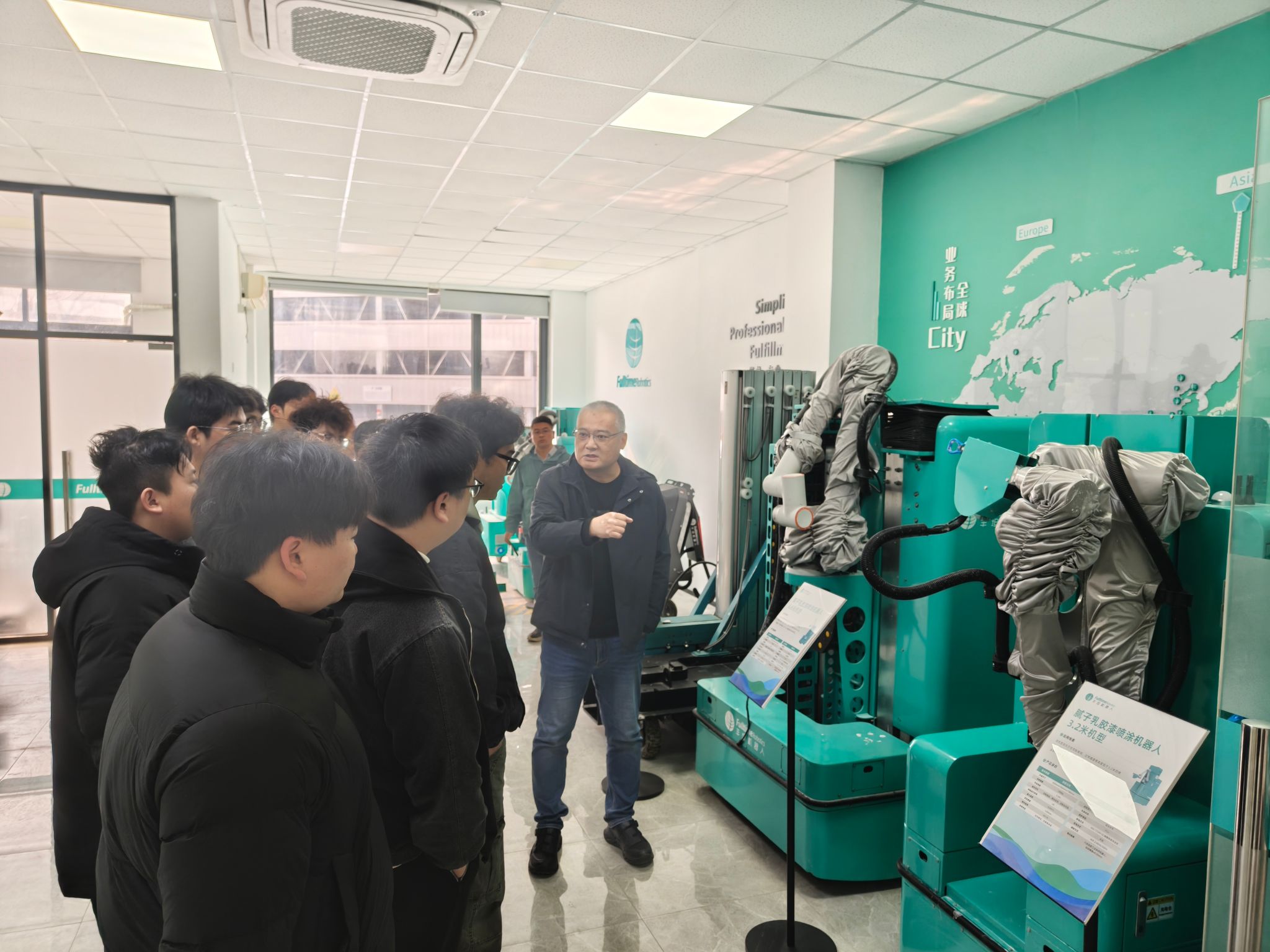 在企业工作人员的专业引导下,师生一行实地参观了企业产品展厅,全方位了解企业自主研发的各类建筑机器人产品体系,深入了解不同品类机器人的核心技术、功能特点及实际施工场景中的应用逻辑。现场观看喷涂机器人作业演示环节,让师生们直观感受到智能建造技术为传统建筑行业带来的技术革新与产业升级,对建筑行业的智能化发展有了更具象、更深刻的认知。